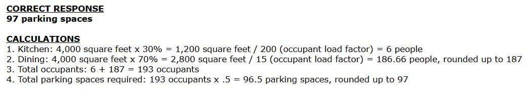 An architect is designing a 4,000-square-foot restaurant building. The kitchen will occupy 30% of the space and the remaining space will be for dining with tables and chairs. The local code requires 0.5 parking spaces per occupant.
