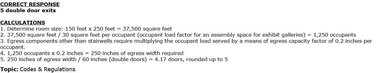 An architect is determining the size and number of doors for a large, rectangular assembly room that will be used as an exhibition gallery. The assembly room will be 150’-deep by 250’-long. The AHJ requires that all means of egress components other than stairways use an egress capacity factor of 0.2 inches per occupant. All assembly room exits will use double doors.