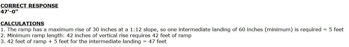 An architect is designing a building renovation and needs to add an accessible ramp at an existing entrance that currently only has stairs. The dimension between grade and the building entrance is 42”. A survey shows no changes in grade on the site around the building. Accessibility code requires wheelchair accessible ramps to be between a 1:12 and 1:20 slope, with a maximum rise of 30” between 60”-long landings.