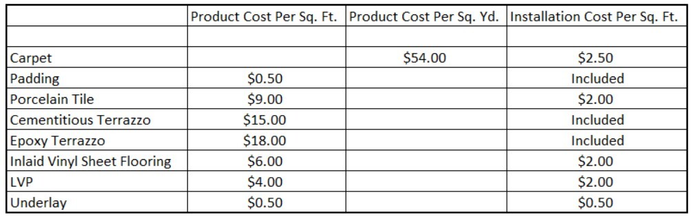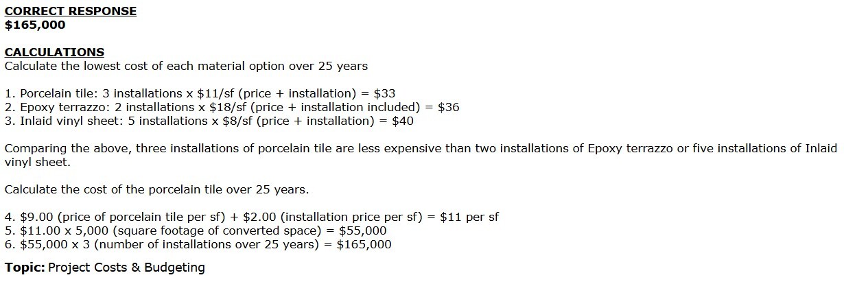 Comparing the above, three installations of porcelain tile are less expensive than two installations of epoxy terrazzo or five installations of inlaid vinyl sheet.