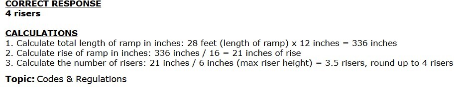 An architect is adding a set of stairs from grade to the top landing of an existing ramp. Excluding all landings, the existing ramp is 28 feet long and has a 1:16 slope. A survey shows no changes in grade on the site around the building. Each riser must be no more than six inches high.