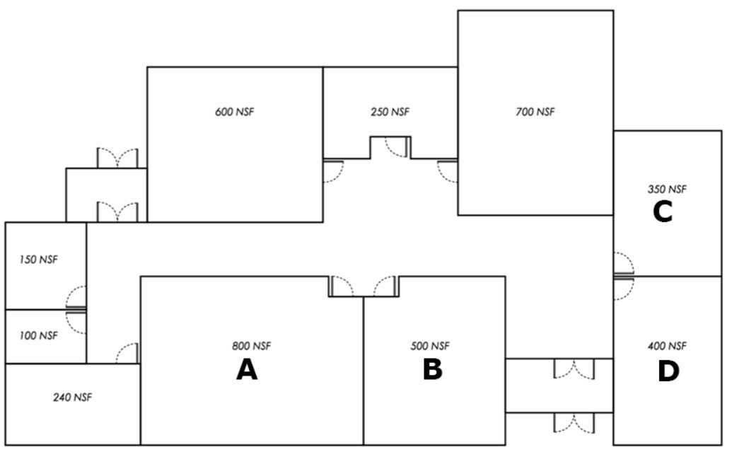 An architect is in the programming phase of a tenant improvement project for a small university office suite in an existing building. The client has asked for five 120-square-foot offices for staff members, a 200-square-foot conference room, and a 100-square-foot storage room. The client has a limited budget and would like to minimize the area to be remodeled.