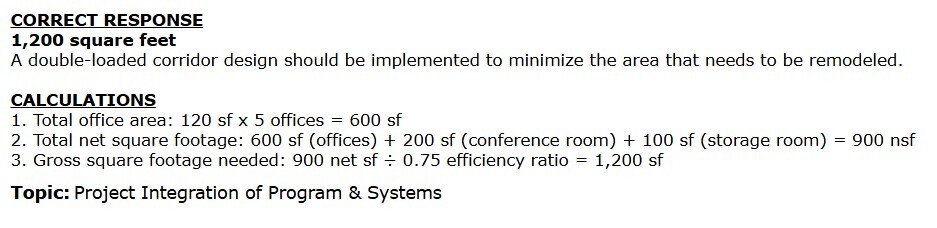 A double-loaded corridor layout minimizes the overall remodeled area, so use the 0.75 net-to-gross efficiency.