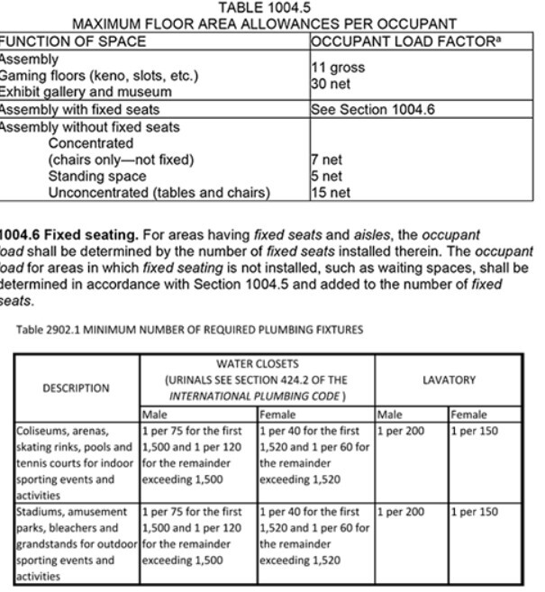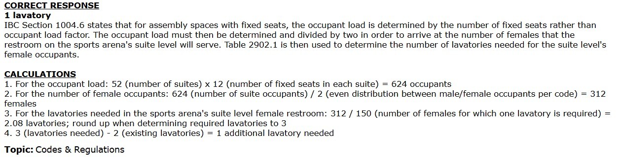 An architect is renovating an existing sports arena. There are 52 suites on the arena’s suite level at 250 square feet each. Each suite has 12 fixed seats only with views to the field below. Suites are the only spaces on this level. There are currently two female lavatories on the suite level.