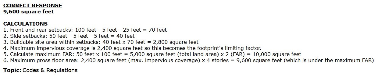 Max gross building area based on impervious coverage and max stories = 2,400 sf × 4 stories = 9,600 sf