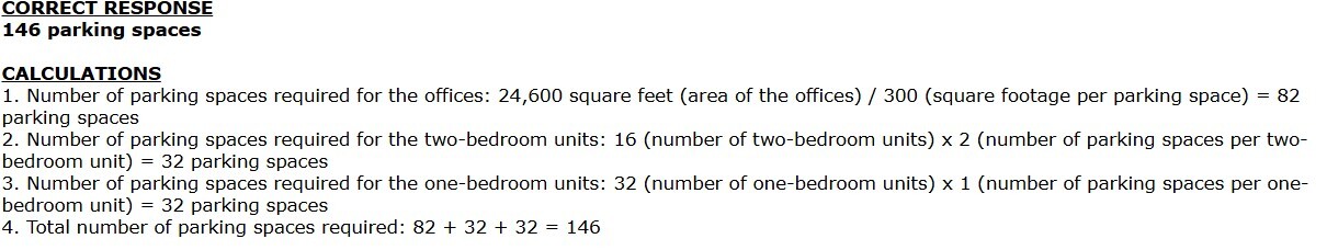 Number of parking spaces required for the offices: 24,600 square feet / 300 square feet per parking space = 82 parking spaces. Number of parking spaces required for the two-bedroom units: 16 x 2 = 32 parking spaces. Number of parking spaces required for the one-bedroom units: 32 x 1 = 32 parking spaces. Total parking spaces required: 82 + 32 + 32 = 146.