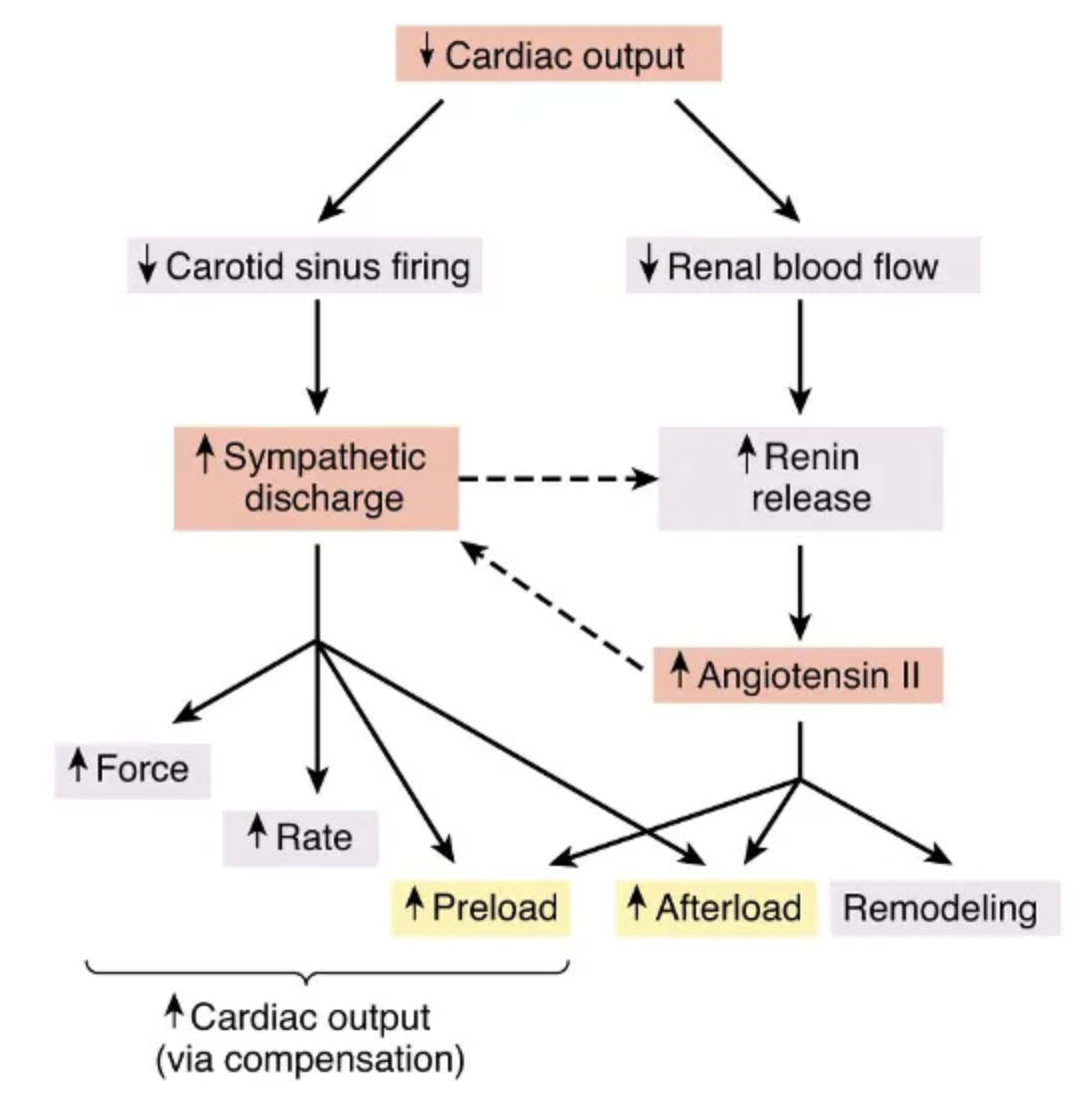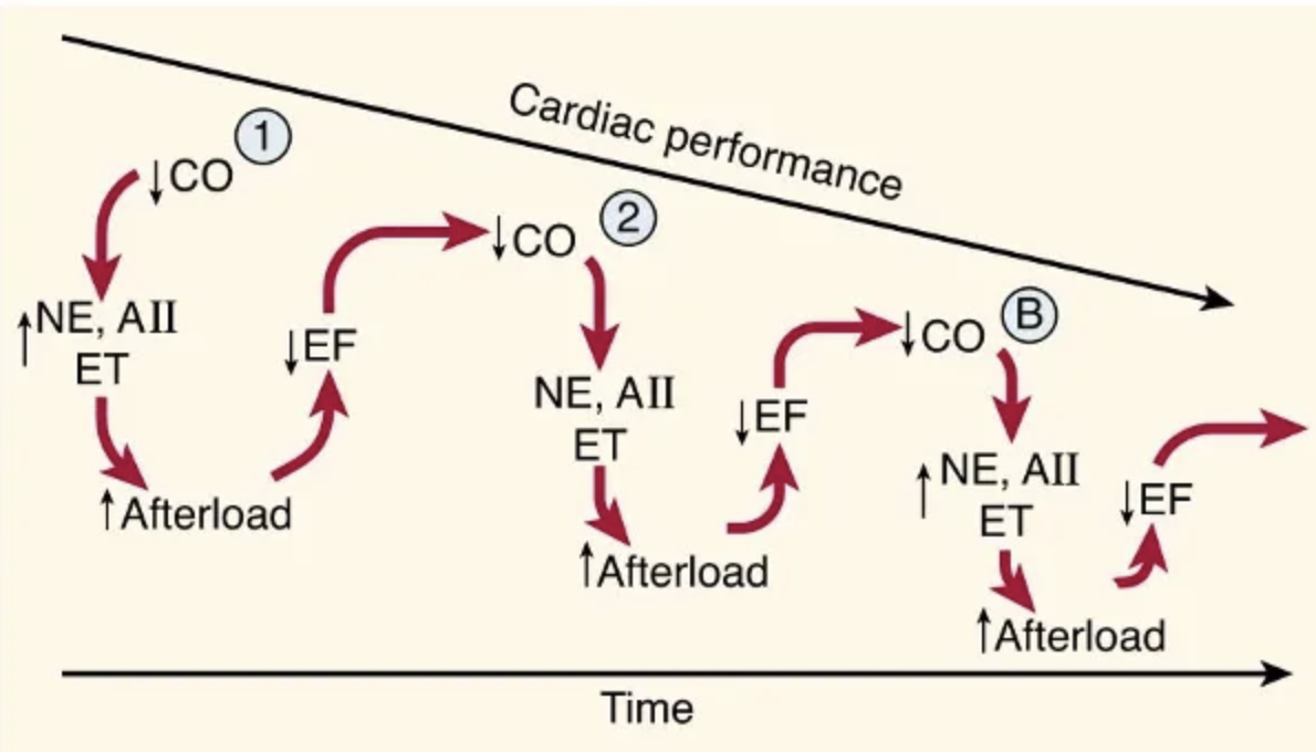 - Chronic; heart more stiff/thicker walls (chronic HTN)