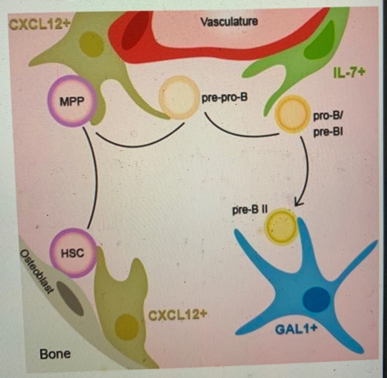 —> entrent en contact avec c stromales qui expriment CXCL 12 (DSF-1alpha)