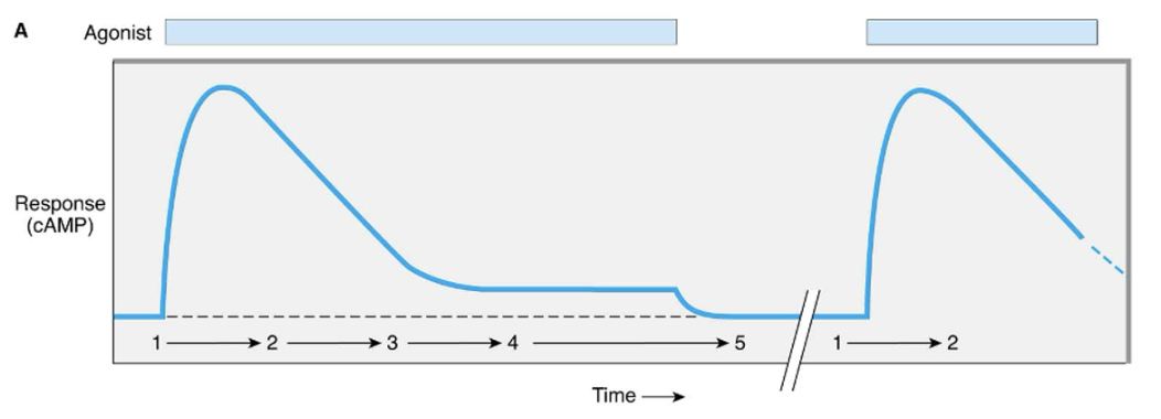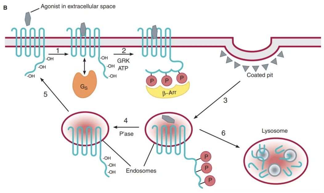 Repeated or prolonged exposure of cells to agonist favors degradation → promoting receptor down-regulation rather than resensitization