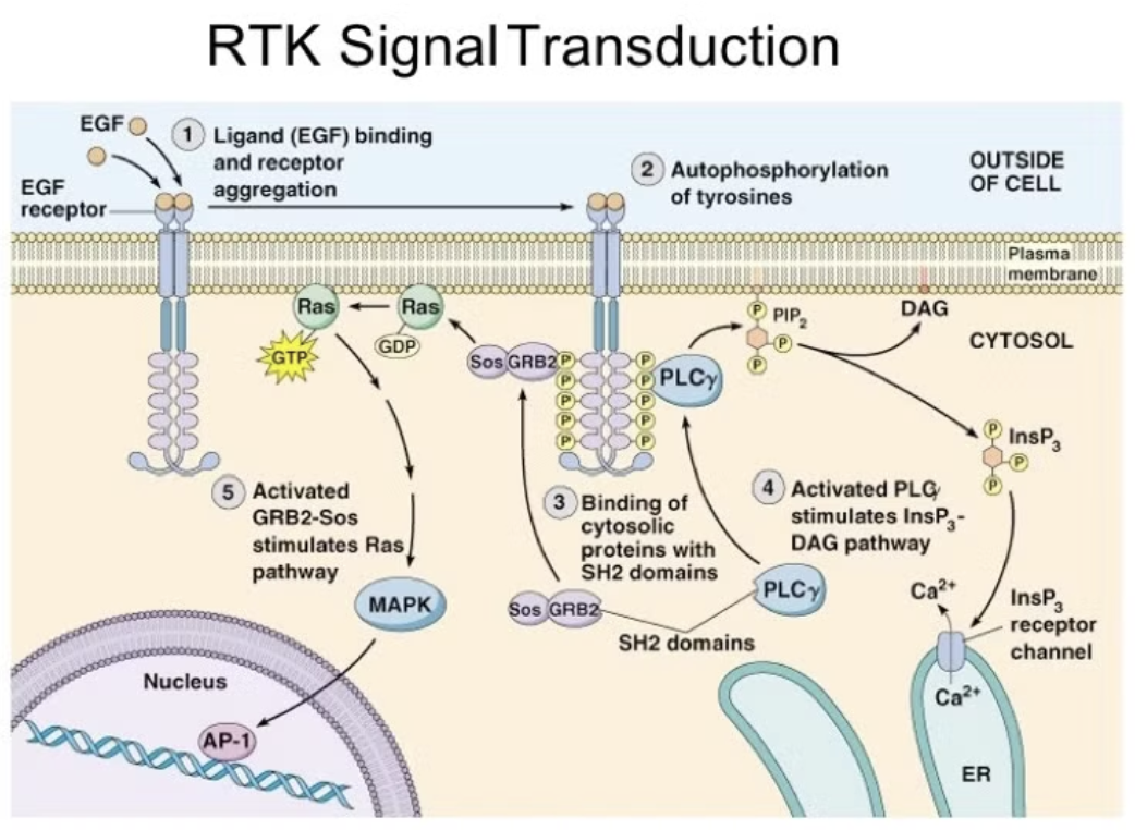 2. RTK activated by dimers and phosphorylates tyrosines on receptor dimer from ATP