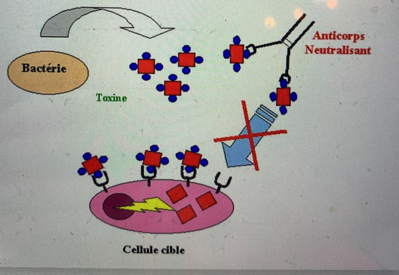 La présence d’Ac neutralisants spécifiques à la toxine empêche la toxine de lier son récepteur sur la cellule cible