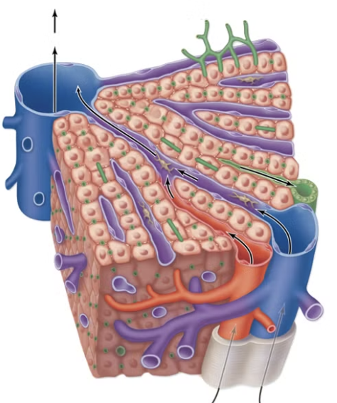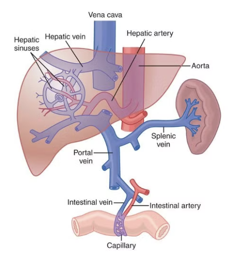 Systemic Circulation → hepatic artery → Sinusoids → Hepatic vein → Vena cava → Systemic Circulation