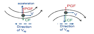 flow around curved contours is subject to acceleration towards the center of curvature due to an imbalance between the coriolis force and pressure gradient force.