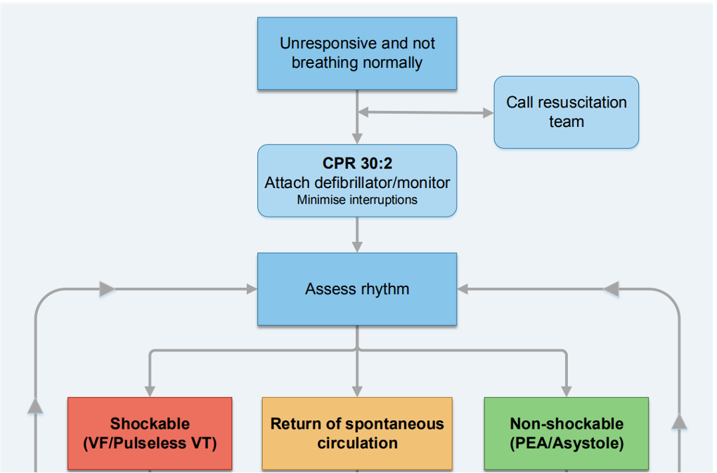CPR 30:2 (100-120 compressions per min @ 5-6cm)