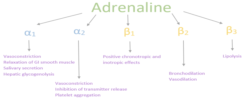 Normally adrenaline would cause a bit of vasodilation - in the absence of a beta-blocker, a systemic dose of epinephrine does not have much effect on mean blood pressure because it has both alphaadrenergic effects (producing vasoconstriction) and beta-adrenergic effects (producing vasodilation).