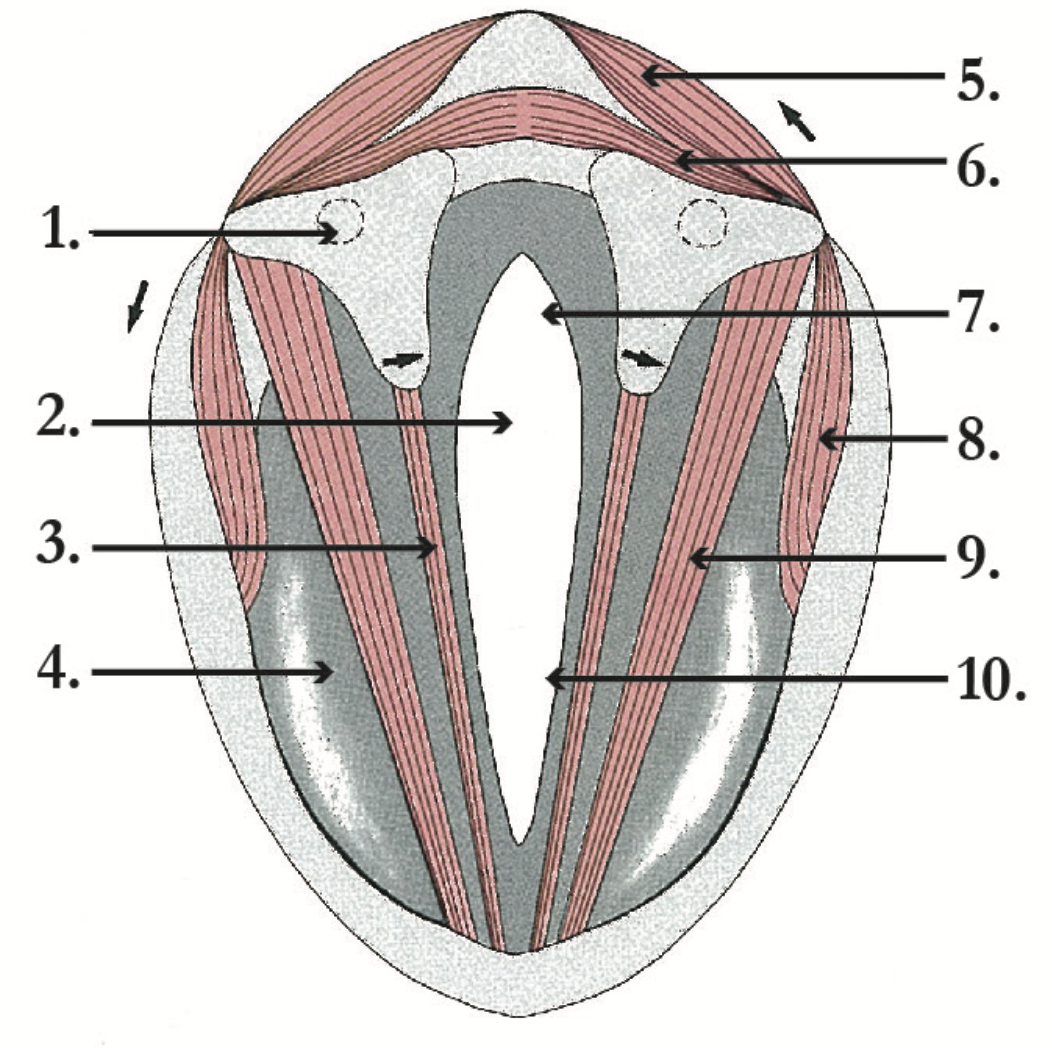 Insertion: Proc. muscularis of cartilago arytenoidea