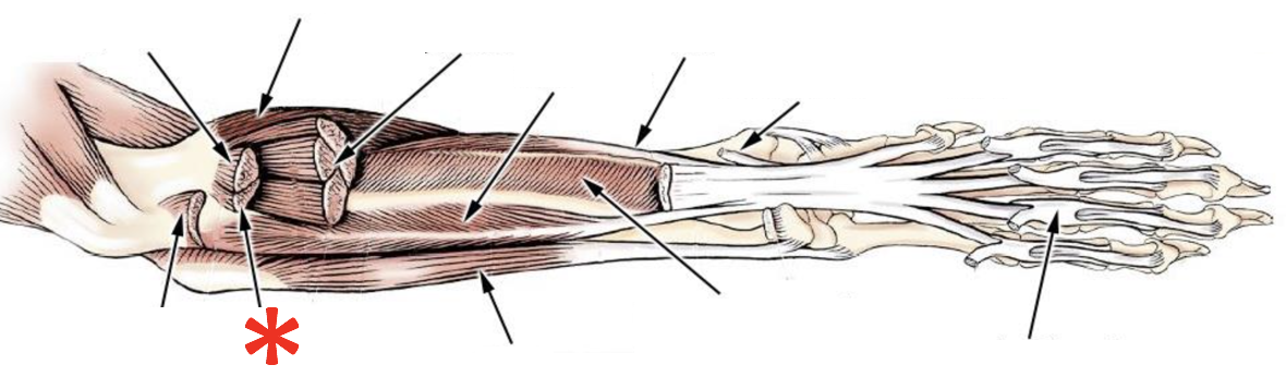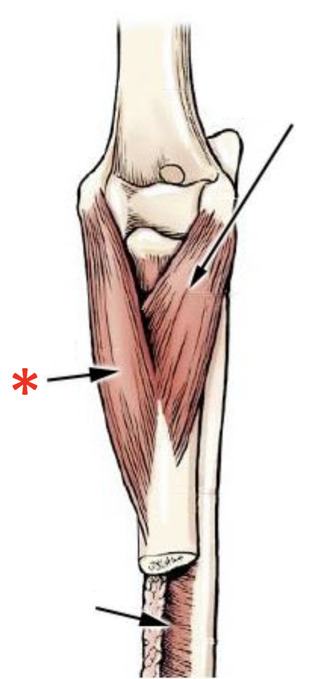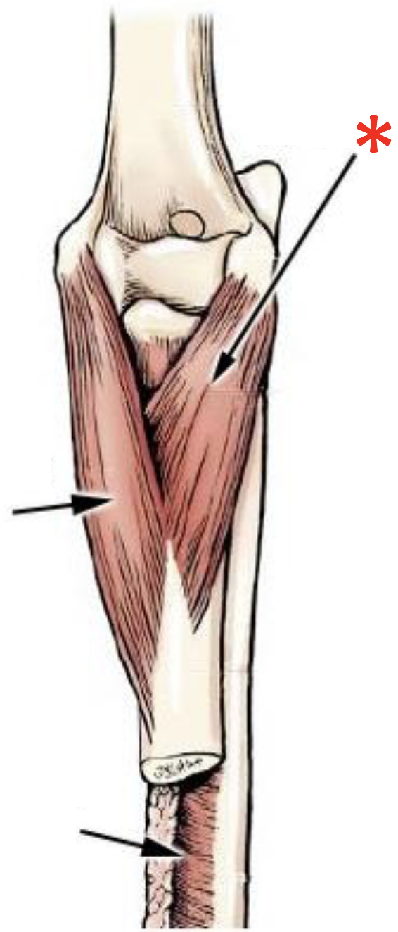 **M. flexor digitorum profundus** **Origin:** *Various* **Insertion:** Distal phalanx of digits I-V **Action:** Flex Carpus and Joints of Digits I-V