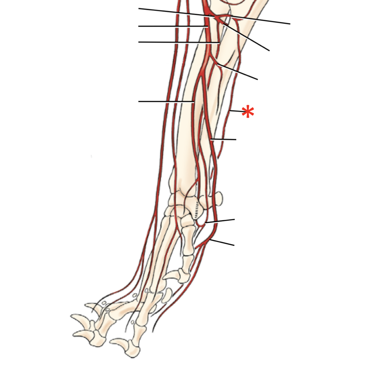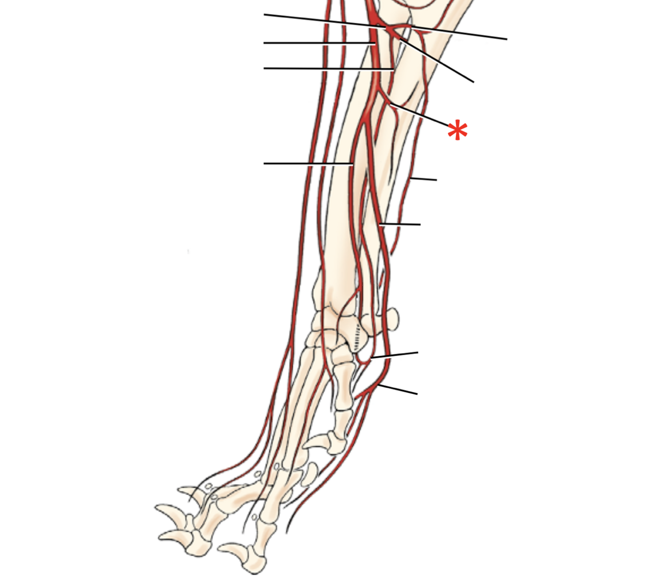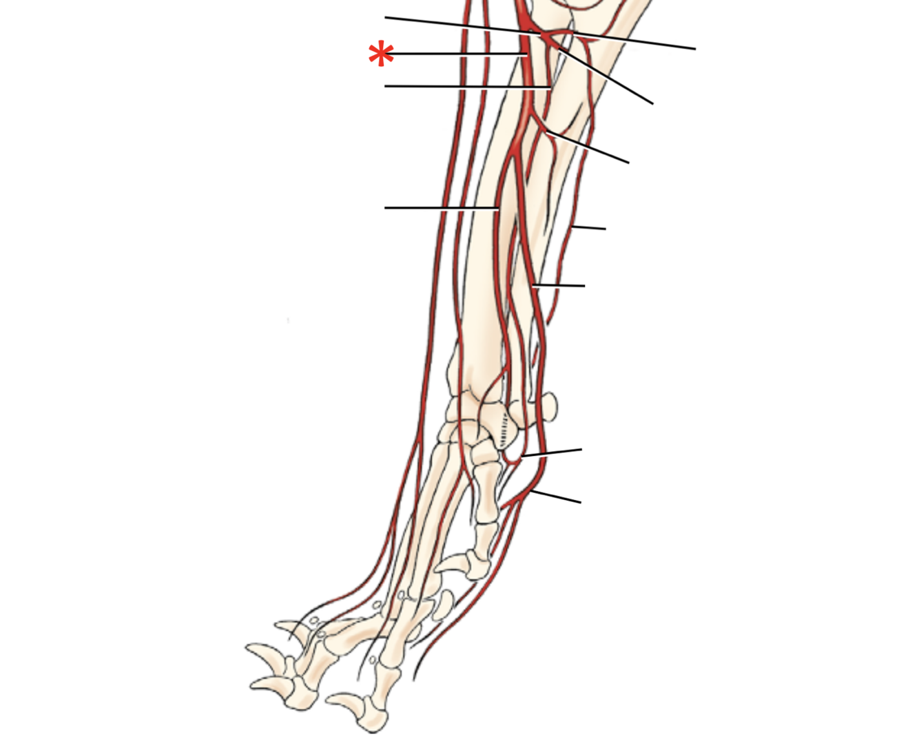 **Deep antebrachial artery** * M. flexor carpi radialis * M. flexor carpi ulnaris * M. flexor digitorum profundus * M. flexor digitorum superficialis