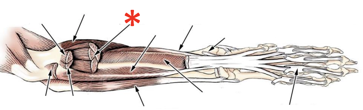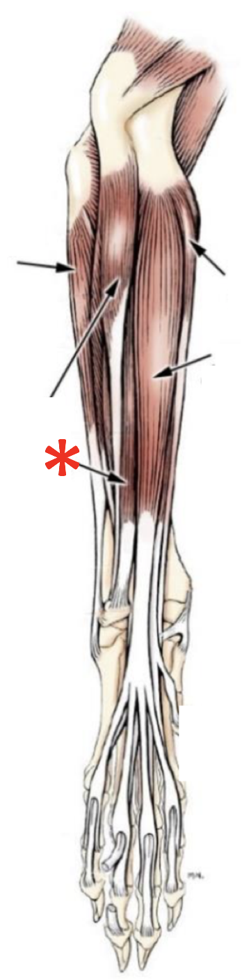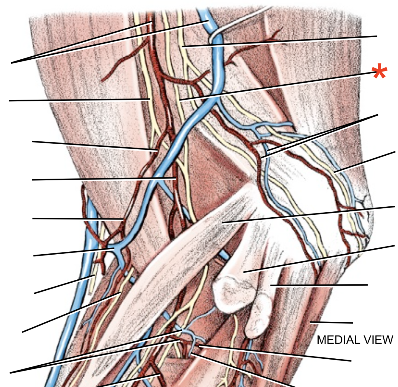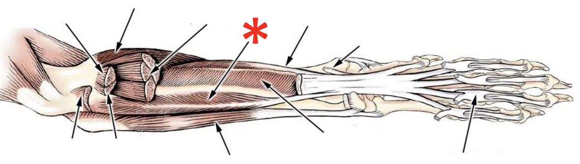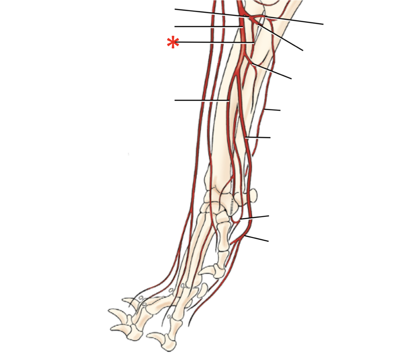 **Deep antebrachial artery** * M. flexor carpi radialis * M. flexor carpi ulnaris * M. flexor digitorum profundus * M. flexor digitorum superficialis