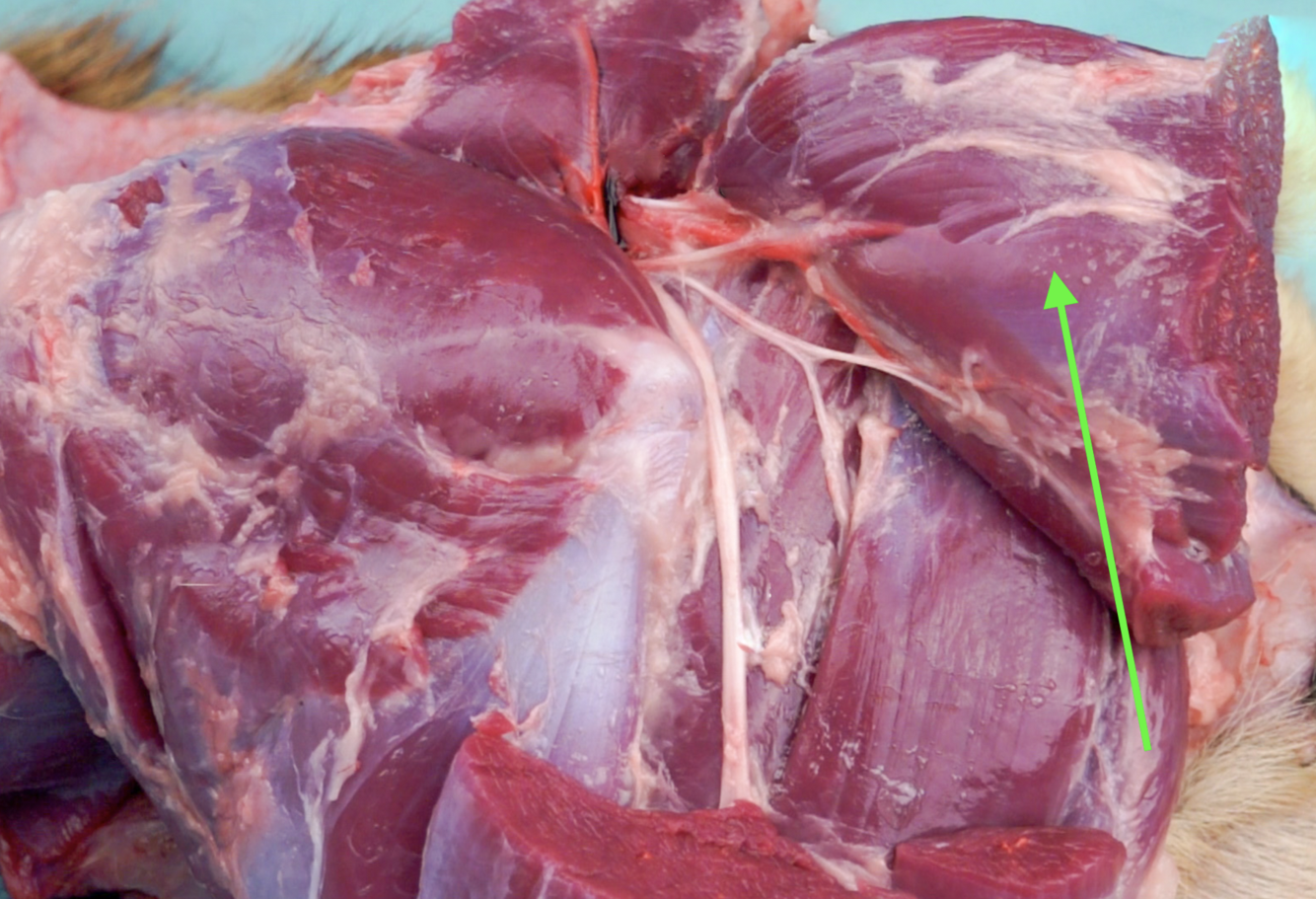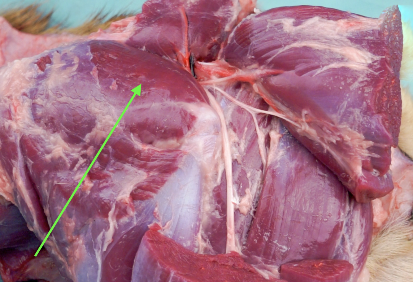 **N.** **ischiadicus****/ Sciatic nerve** * Passes between *m.* *gluteus* *medius et* *profundus* * Transect *m. biceps femoris*, nerve should be visible