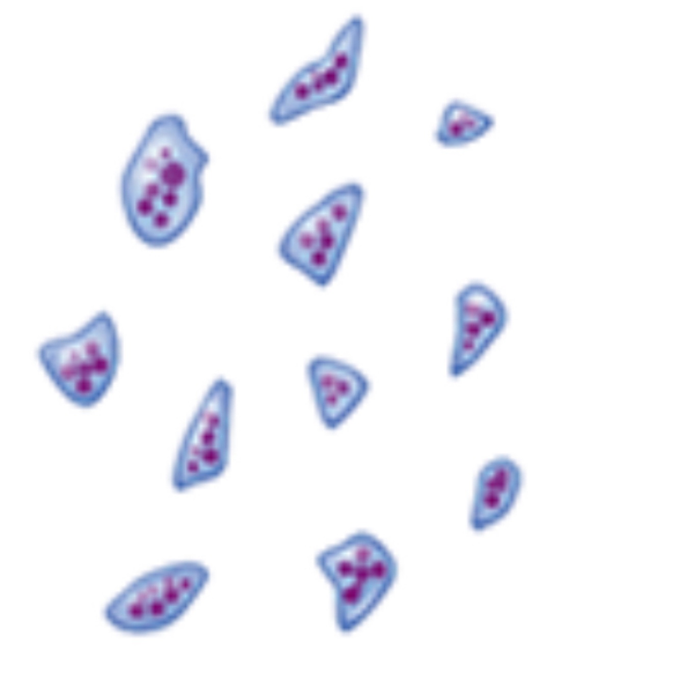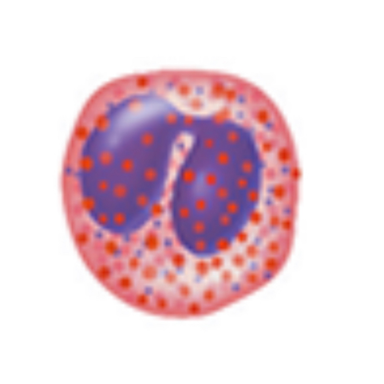 Eosinophil (eskimo wears earmuffs) Granulocyte Bilobed nucleus Red granules Kill parasitic worms Helps with allergies and asthema