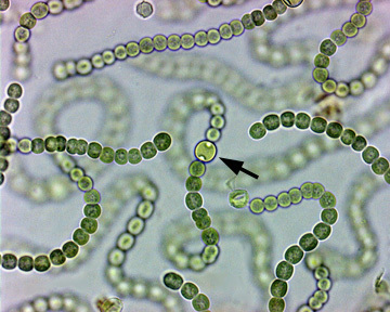Nostoc: Photosynthetic cyanobacterium. Filamentous colonies of sperical bacteria.