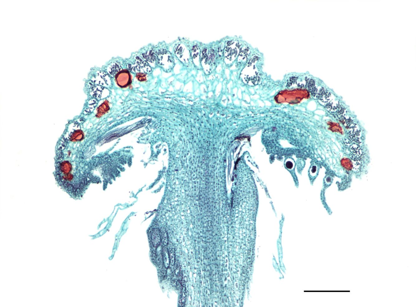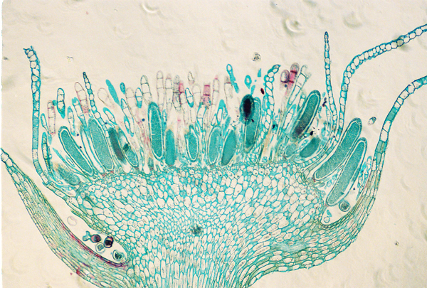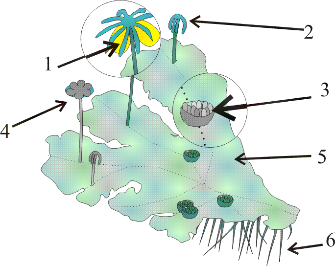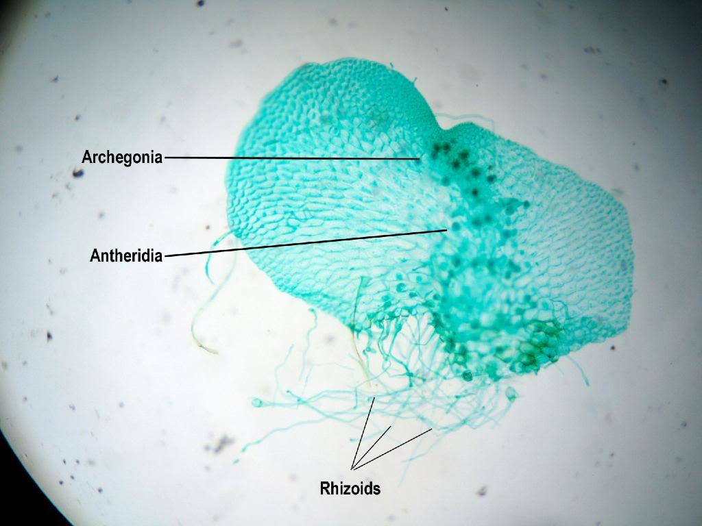 1:Sporophyte 2:Gametophore of female gametophyte. 3:Gemma Cups 4:Male Gametophyte 5:Thallus.