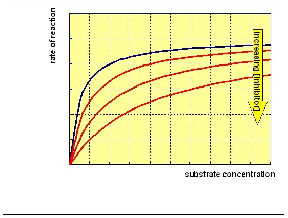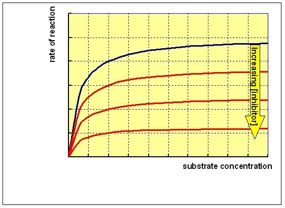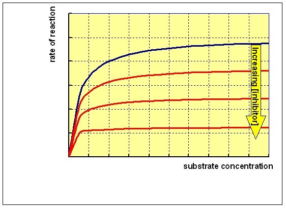 This means that increasing the concentration of substrate will not relieve the inhibition, since the inhibitor reacts with the enzyme-substrate complex. Reacting the enzyme with a range of concentrations of substrate at different concentrations of a non-competitive inhibitor will give a family of curves as shown below: