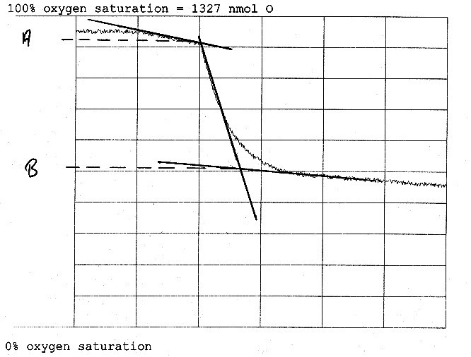 point B = 40 mm = 40 / 78 = 0.512 x 1327 nmol O = 680 nmol O