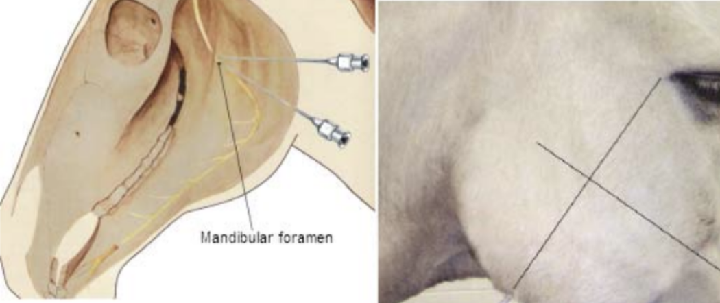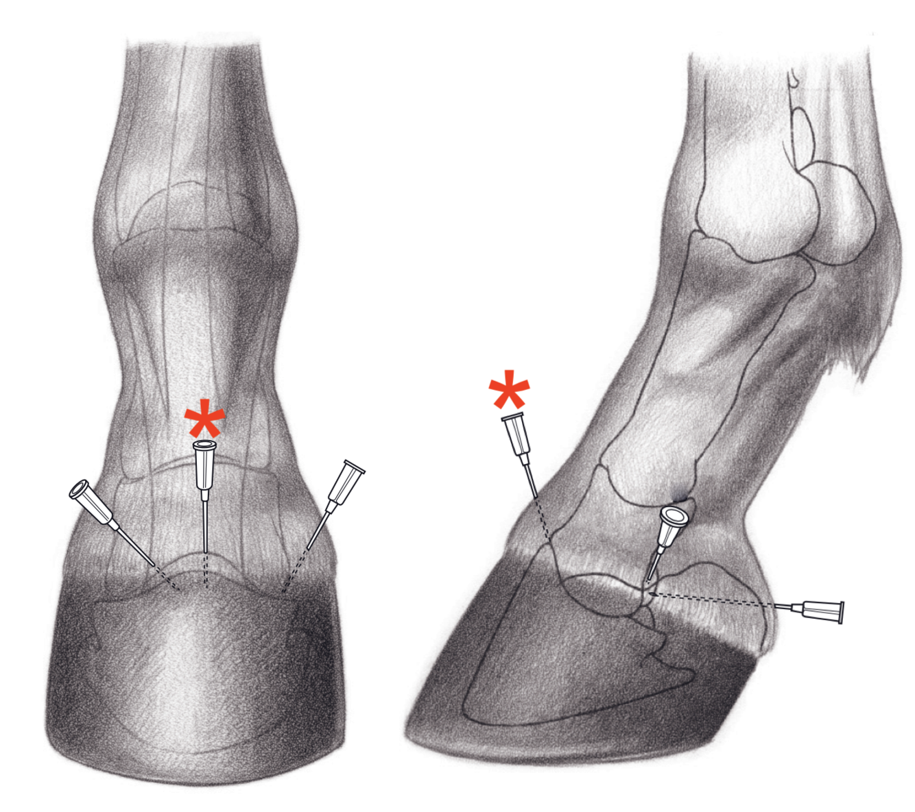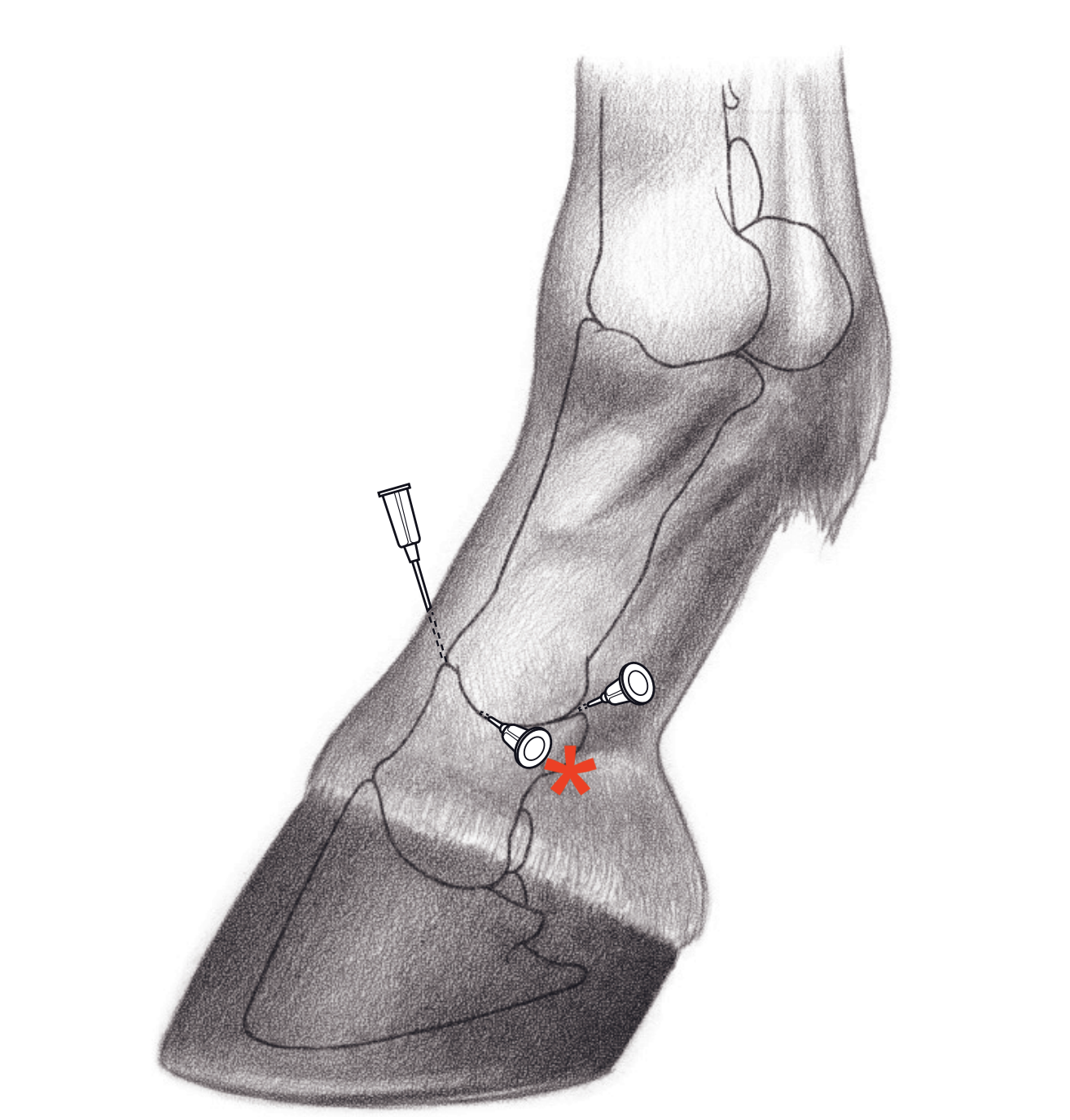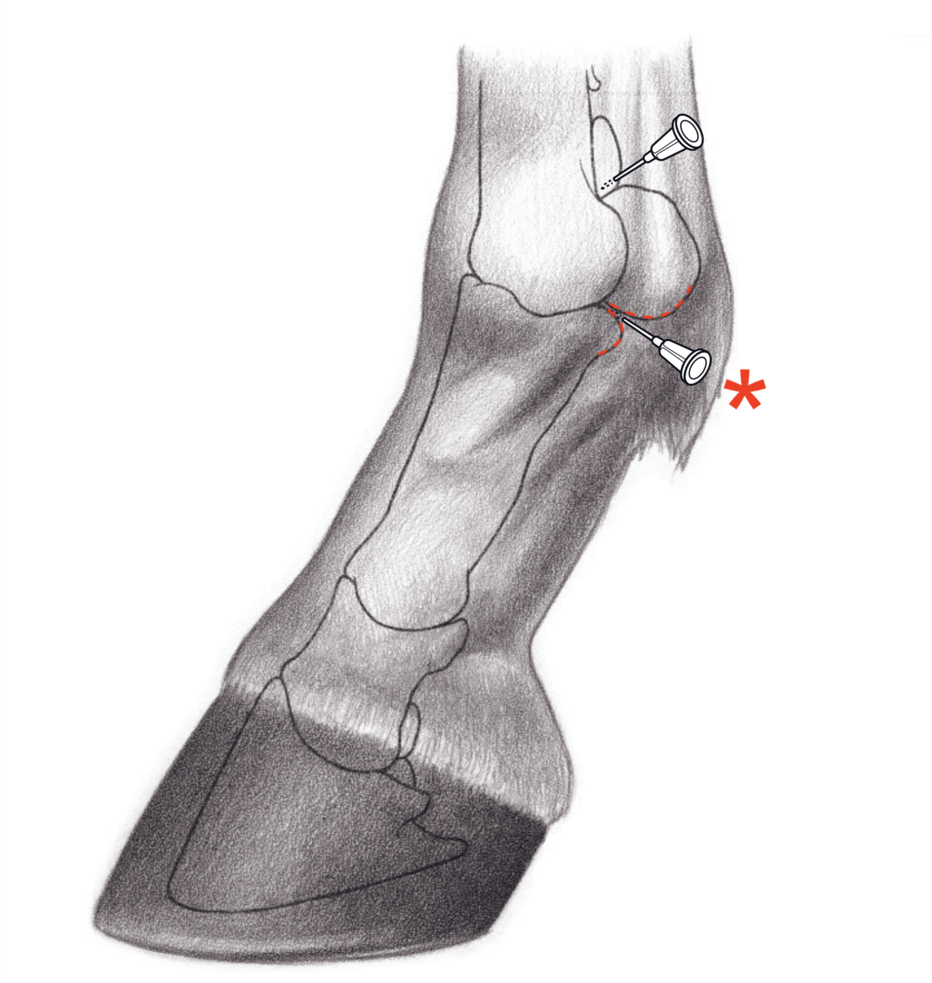 Describe the needle access of the fetlock joint (distal palmar/plantar approach)
