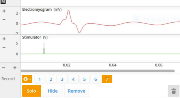 What is the approximate latency between the stimulus and the response in the elctromyogram shown below (the scale on the X axis is in seconds)?