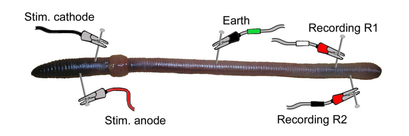 The stimulating current traveling directly to the recording electrodes through the body of the worm, or through any liquid on its surface
