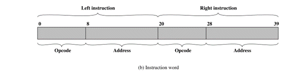 The second one is Instruction word, they store 20 bits in the left instruction and 20 bits in the right instruction. 8 bits are used for the opcode and 12 bits for the address. Opcodes are already pre-written instructions for example for addition or subtraction and that are stored in the memory.