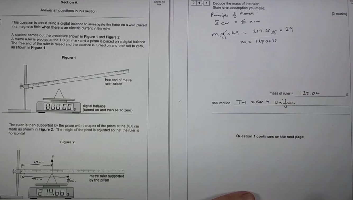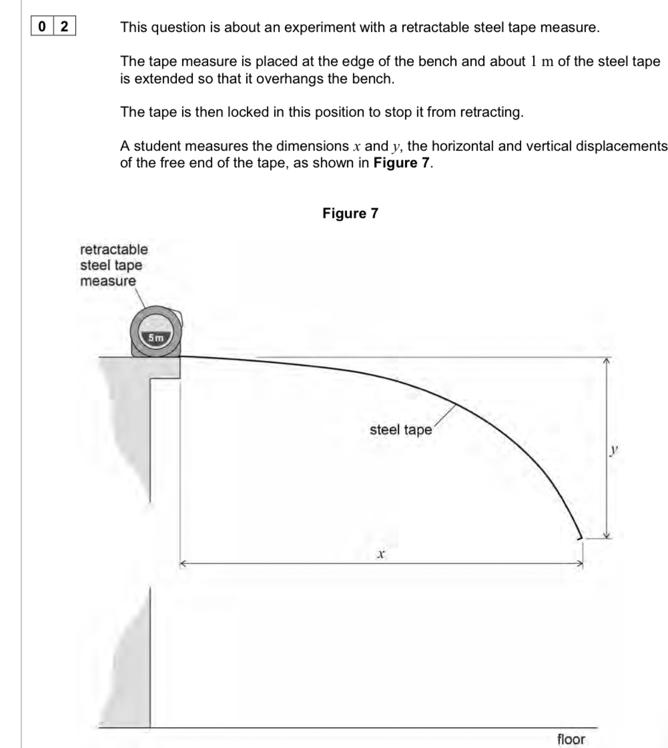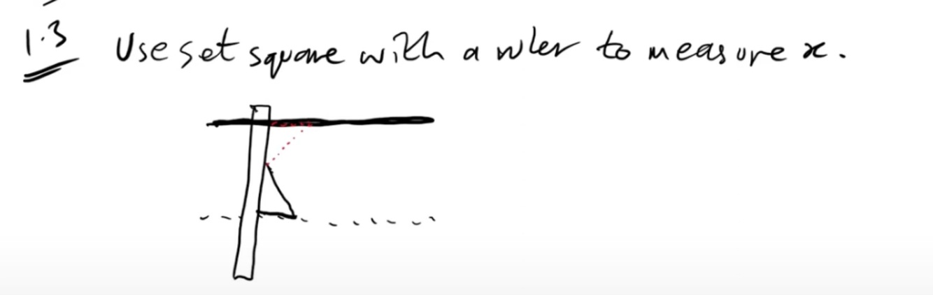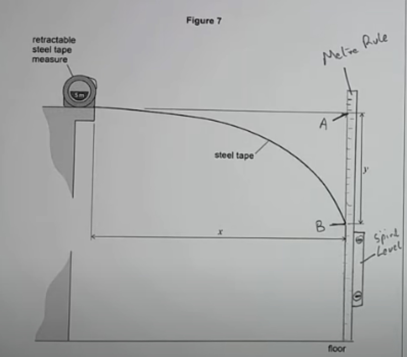 Place a metre ruler vertical against the end of the steel tape. Use a level to make sure it is vertical. Calculate at eye level values A and B and to calculate y, y = A - B