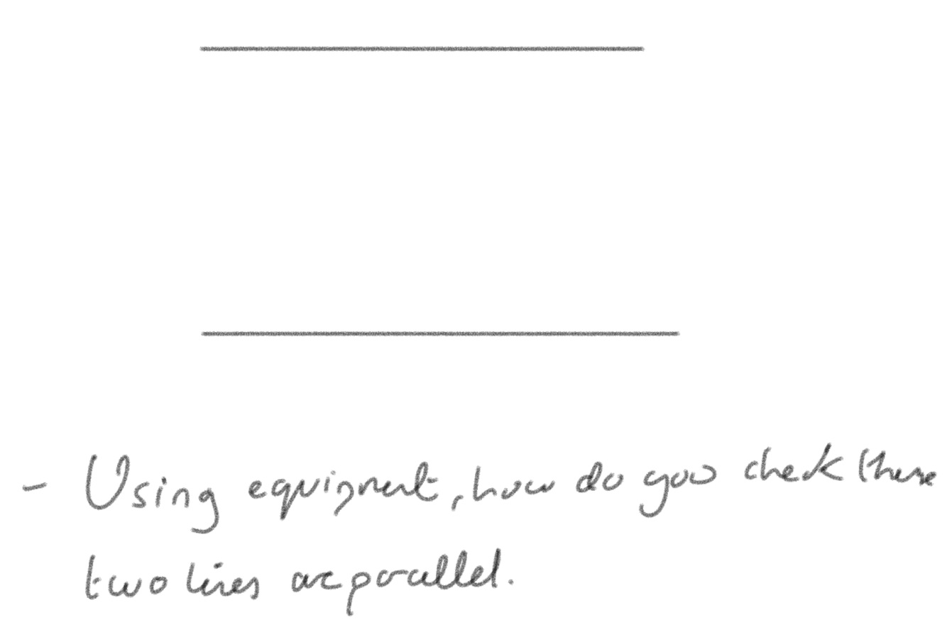 Use ruler and make it perpendicular to the lines. Place set square along the ruler to prove they are parallel