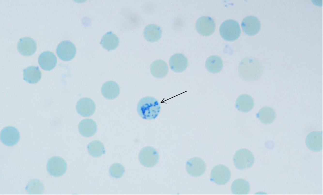 And no arrow- Heinz Bodies (points to oxidative damage)