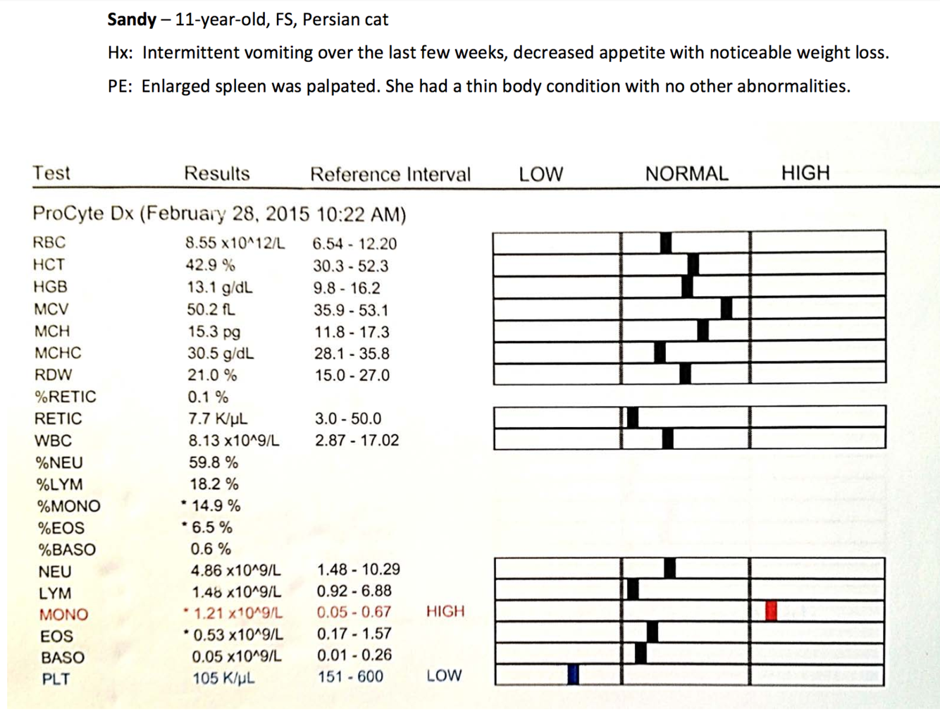 PE: Temp: 39.7 C RR 56. Pale and icteric mucous membranes. Enlarged spleen and liver.