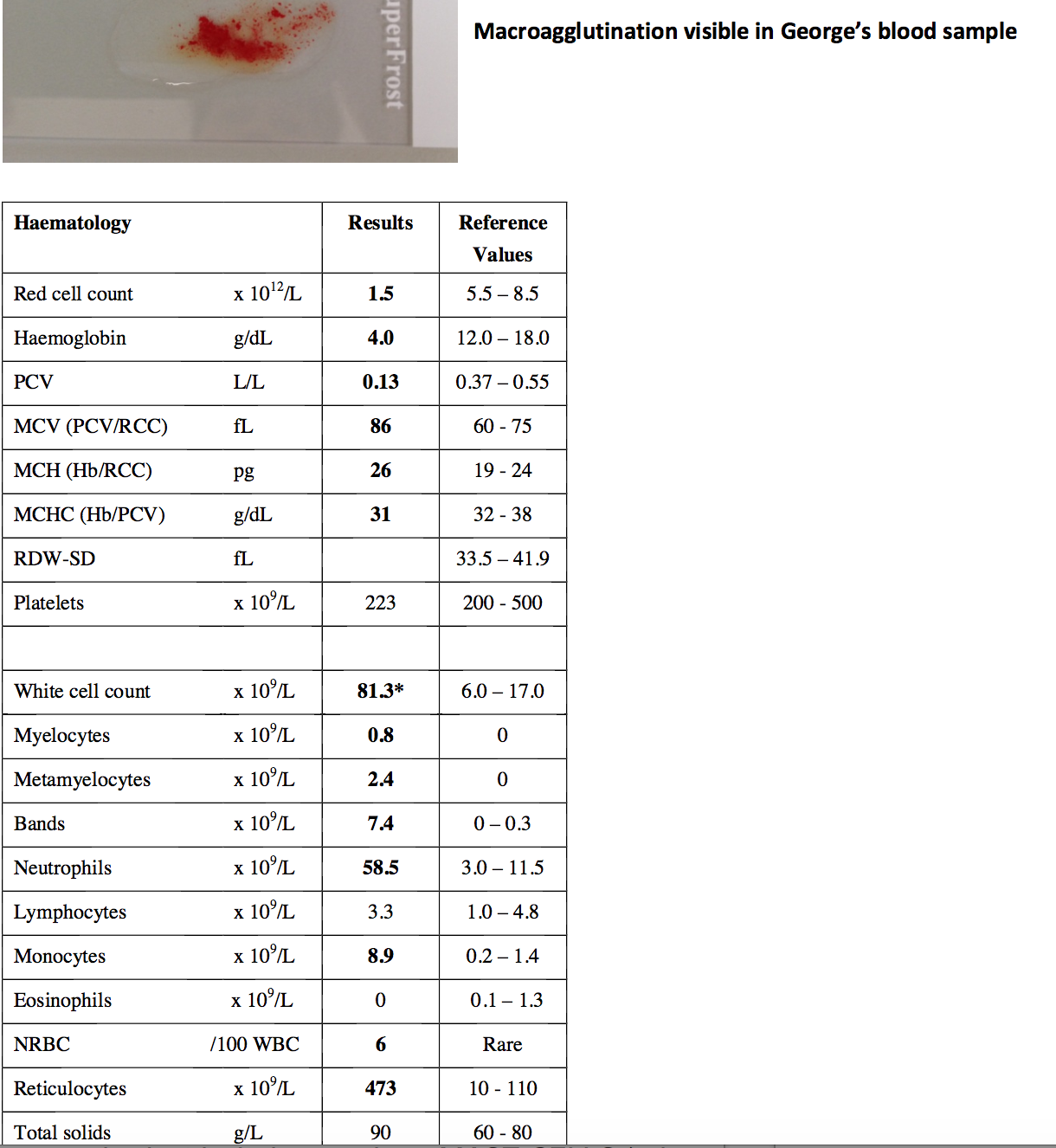* Very high WCC because of the NRBC– but still massive leukocytosis not uncommon in haemolytic anaemia