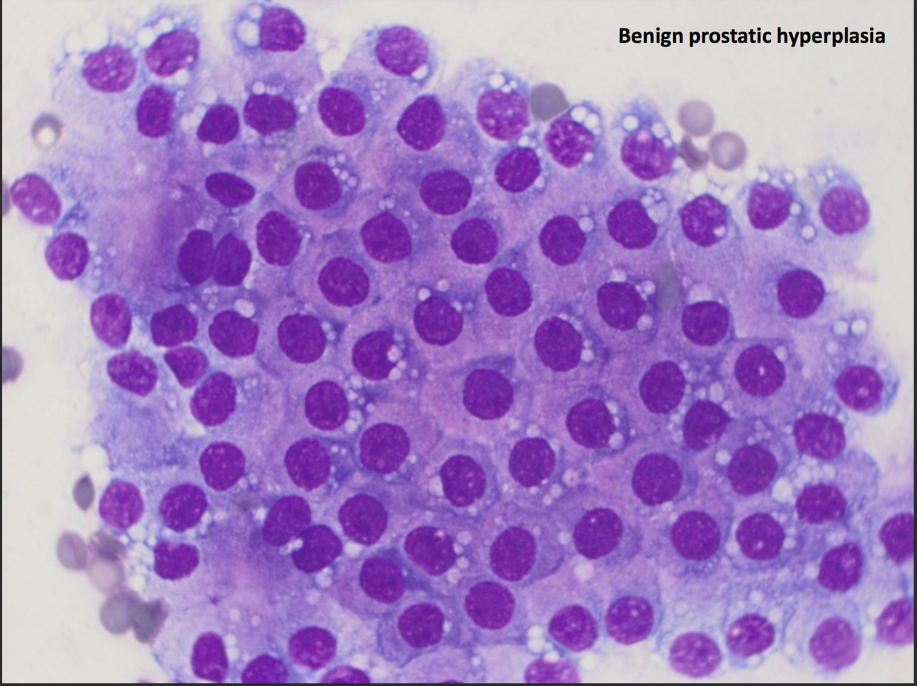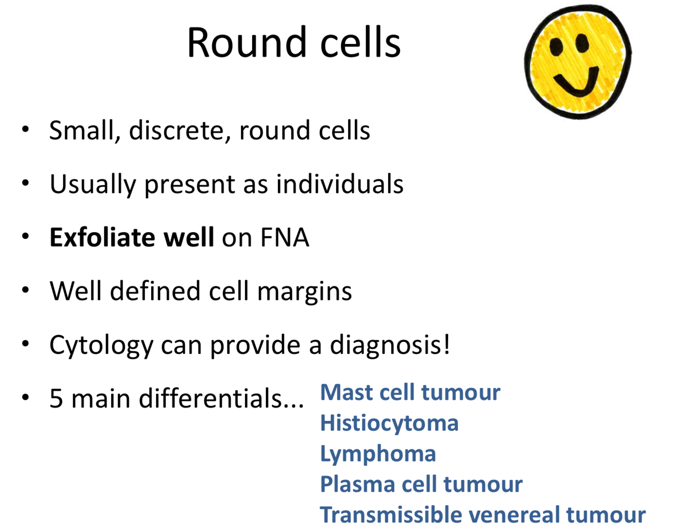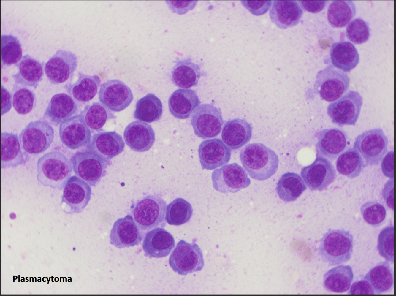 * atypical cells in the feathered edge- round nucleus, cytoplasm packed with dark granules– MAST CELLS (other ddx is basophil– in cats lavender granules)