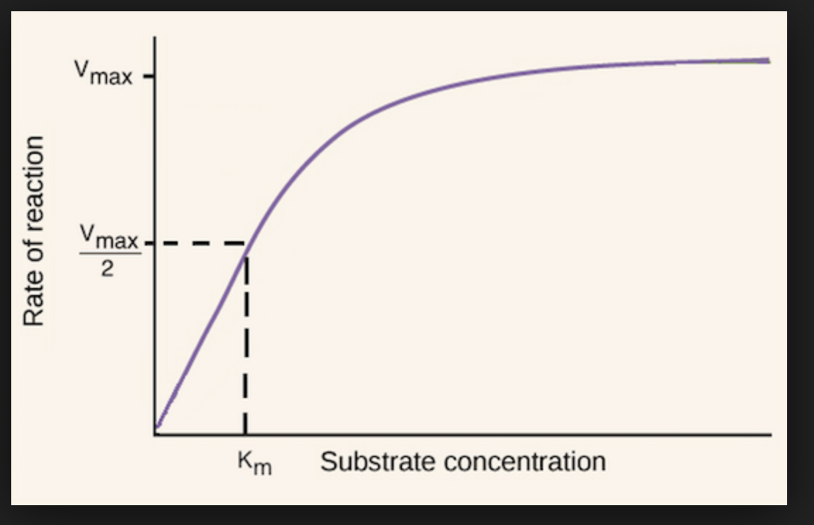 KM (known as the Michaelis constant) is the substrate concentration at which the rate of reaction is exactly half that of the Vmax.