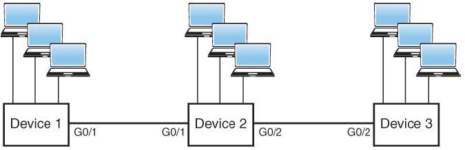 Examine the figure. If devices 1, 2, and 3 are all Cisco Layer 2 switches in their default configuration, how many collision domains exist in this