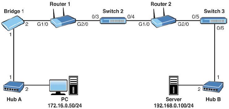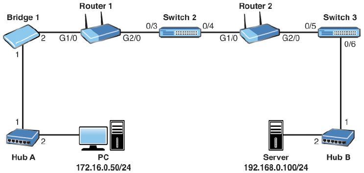 Examine the topology shown in the figure. The PC has sent a Ping request to the Server. Which devices in the network operate only at the physical layer of the OSI reference model? (Choose two.)