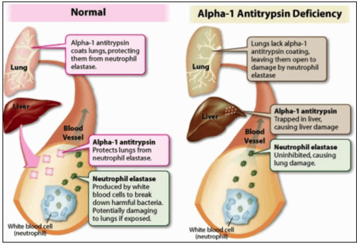 Alpha-1 antitrysin deficiency is an inherited disorder that may cause lung disease and liver disease. Affected individuals often develop emphysema, which is a lung disease caused by damage to the small air sacs in the lungs (alveoli). Characteristic features of emphysema inlcude difficulty breathing, a hacking cough, and a barrel-shaped chest.