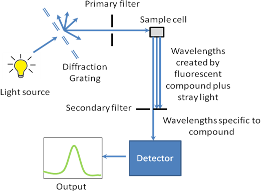 A fluorometer or fluorimeter is a device used to measure parameters of fluorescence: its intensity and wavelength distribution of emission spectrum after excitation by a certain spectrum of light. These parameters are used to identify the presence and amount of specific molecules in a medium. Modern fluorometers are capable of detecting fluorescent molecule concentrations as low as 1 part per trillion.