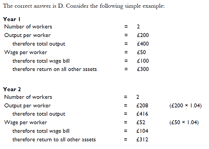 In an electronics company, all assets other than labour, i.e. factories, machinery etc., are constant and valued at £1 million. The annual wage bill for the labour force is £0.25 million. If both output per worker and wages increase at 4 per cent per annum, what happens to the return to all other assets?