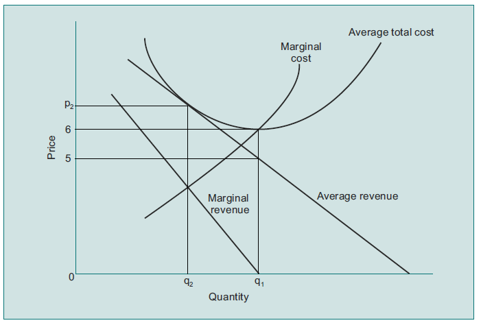 The correct answer is C. The diagram below exhibits the data: at output level 0q1 average total cost is at a minimum and equals £6, average revenue equals £5, and marginal revenue equals zero. The upward-sloping marginal cost curve must pass through the minimum point of the average total cost curve and therefore must intersect the marginal revenue curve at an output level less than 0q1. Since profit maximisation requires that marginal revenue equals marginal cost, the firm should reduce output to 0q2, and charge a higher price p2.