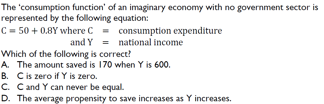 The correct answer is D. C = 50 + 0.8Y; when Y = 600, C = 50 + 0.8(600) = 530. Therefore S = Y − C = 70, and therefore option A is incorrect. When Y = 0, C = 50, therefore option B is incorrect. When Y = 250, C = 50 +0.8(250) = 250, therefore option C is incorrect. Since C = 50 + 0.8Y, S = –50 + 0.2Y and so the average propensity to save is S/Y = -50+0.2Y/Y As Y increases, S Y increases.