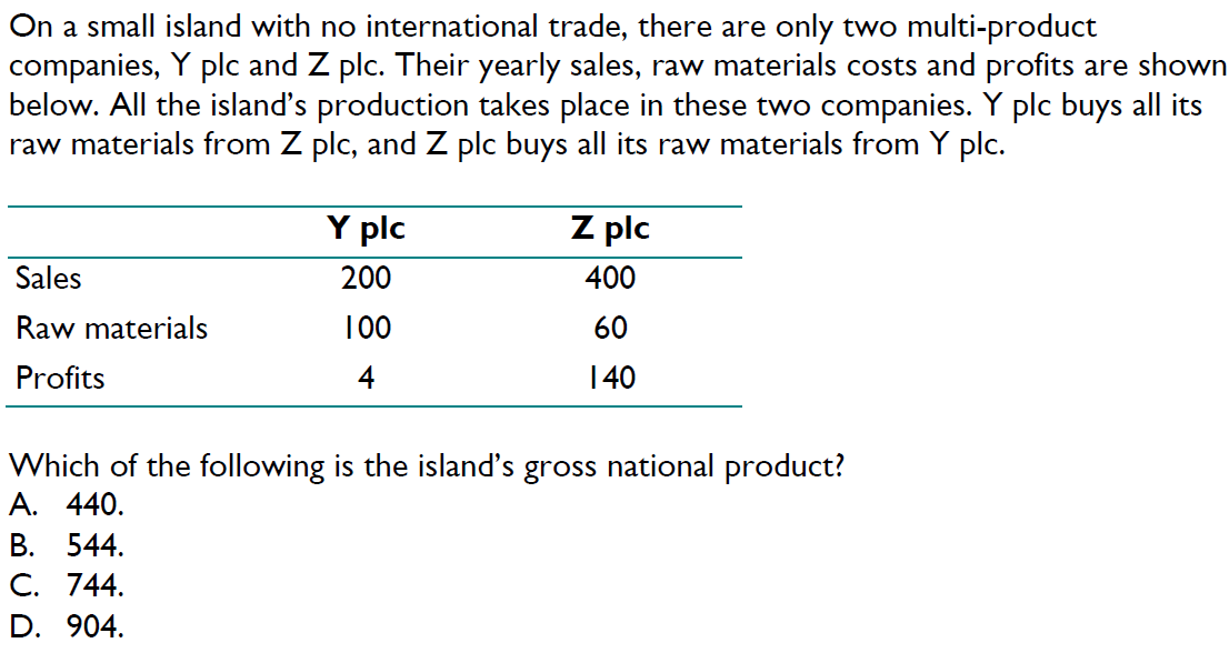 The correct answer is A. If a miller sells £100 worth of flour to a baker who uses it to make bread which sells for £200, including both the flour (£100) and the bread (£200) in the national income accounts would involve double counting of the flour. Thus the costs of raw materials in the question have to be subtracted from total sales, i.e. 200 + 400 – 100 – 60 = 440. Insufficient information is given to calculate total income to all factor inputs since only profit figures are given.