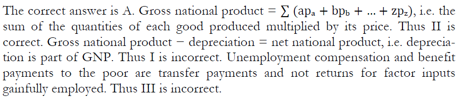 The correct answer is A. Additions to the capital stock are classified under the heading ‘investment’. Houses are part of a nation’s capital stock and thus a new house would be classified as an investment in the year in which it was built. If it were subsequently resold, it would not enter the national income accounts in the year of resale since it would already be part of the capital stock. Thus statement I is correct. By the same logic, the purchase of a second-hand car would not enter the national income accounts. Thus II is incorrect. Also by the same logic, buying a share in an existing company is merely transferring ownership of part of that company to another person or institution. Thus III is incorrect.