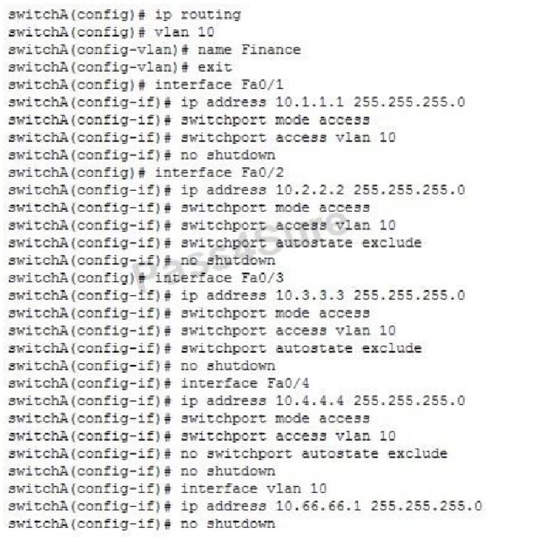 The Fa0/2 and Fa0/3 physical interfaces of switchA do not affect the uplink state of VLAN 10. This is because the switchport autostate exclude command is used on the Fa0/2 and Fa0/3 interfaces. This command causes the exclusion of an interface from the determination of the uplink state of the VLAN (SVI interface) to which the interface belongs.